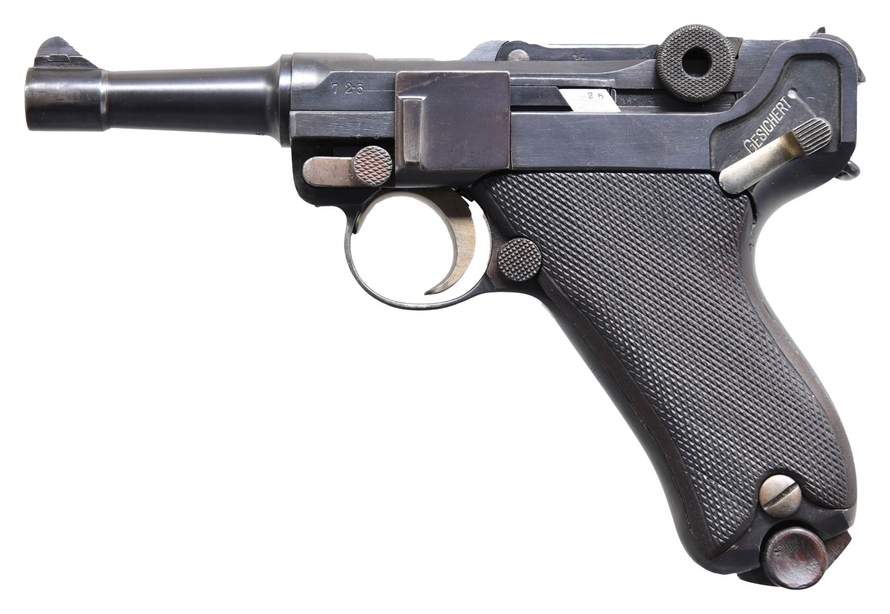 PISTOL. Cal. 9x19mm Parabellum. S# 725. Bbl. 3 1/8". Custom "Baby Luger" semi-automatic pistol produced by an unknown maker. Toggle is marked with the intertwined "DWM" monogram. Front of the frame is marked "GERMANY" below the S#, which is also present on the right side of the bbl. extension. Underside of the bbl. is stamped with a spurious German Crown/N commercial nitro proof. Metal components exhibit a reapplied blue finish overall, with some small parts including the takedown lever, trigger, safety lever, and ejector exhibiting a reheated straw finish. Frame is fitted with 2-piece custom wood grips. Frame has been professionally shortened, with a few porous spots visible on the exterior and a distinctive line present on the interior. Bbl. extension has been fitted with a contemporary production 3" bbl., with the muzzle/front side band appearing to have been threaded on. Aftermarket dovetailed blade front sight, with standard fixed V-notch rear sight. All serialized parts are matching and include the frame, sideplate, trigger, safety lever & bar, bbl., bbl. extension, breechblock, extractor, firing pin, and toggles, with most parts having been renumbered to match. MAGS: 1 spuriously matching shortened 6-rd. CONDITION: very good, with metal components retaining the majority of their reapplied blue finish, exhibiting some spots of light to mild wear, a few spots of light surface oxidation, as well as some spots of mostly mild pitting beneath the bluing. Frame exhibits heavy pitting beneath the bluing under the grip panels. Strawed parts exhibit some light wear and thinning, with varying degrees of surface oxidation present overall. Brilliant mirror bore, exhibiting well defined rifling throughout. Grips show some light smoothing and a few light superficial handling marks, with the left grip exhibiting a repaired break at the bottom left corner of the panel. A well made custom DWM "Baby Luger". (25-1423/MLW). MODERN. $1,500-2,500.