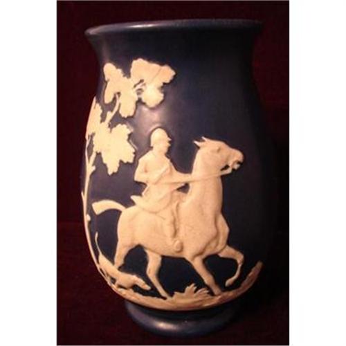 Circa 1890 Antique Weller Pottery Fox Hunting Vase Titled "THE CHASE" in a Dark Blue Color applied with a tree and leaves with a horse being ridden by a fox hunter and a dog sniffing for the foxes decorated in a white applique. This vase measures 8 1/4" in height. Impressed on the bottom is Weller Pottery and a T off to one side.