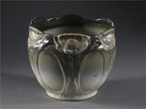Nouveau-style molded pottery jardiniere with lily pattern motif, impression signature at under side reading ''Weller.'' Some imperfections embedded in glaze. First half 20th c. Approx. 7'' H