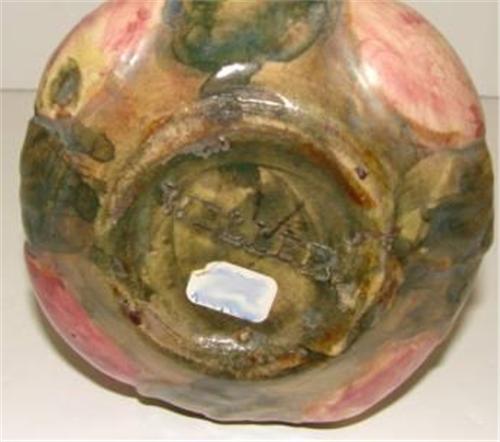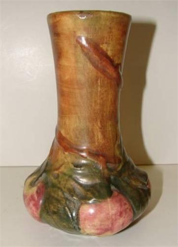 WELLER POTTERY BALDIN VASE. Matte glaze. Relief decorated with branches, fruit, & leaves. Stamped on bottom “Weller”. 6” H