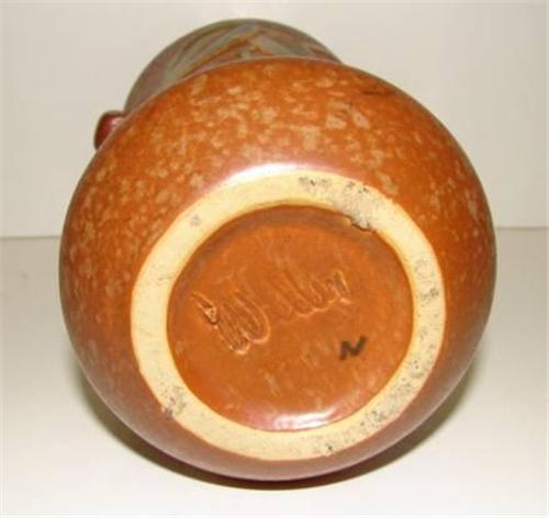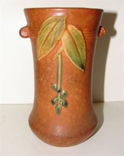 WELLER POTTERY CORNISH VASE. Double handles. Relief decorated with leaves and berries. Signed on bottom “Weller”. 6.5” H