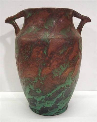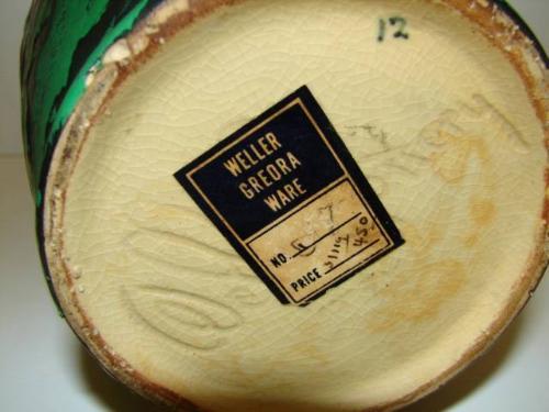 WELLER POTTERY GREORA VASE. Double handles. Signed on bottom “Weller Pottery”. Retains Weller label on bottom. 9.25” H