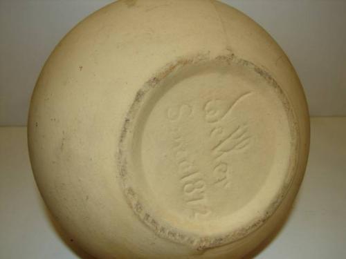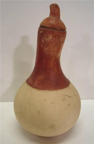 WELLER POTTERY OLLAS WATER BOTTLE WITH LID. Gourd form. Shows loss of glaze to areas at top and on lid. Signed on bottom “Weller/Since 1872”. 11.5” H