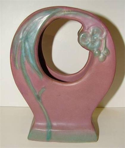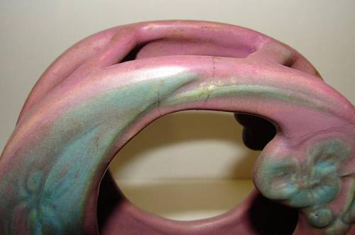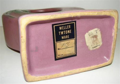 WELLER POTTERY TUTONE CIRCULAR VASE. Shows one tight hairline crack at top. Retains Weller label on bottom. 7.5” H
