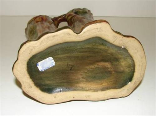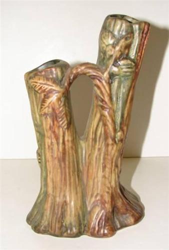 WELLER POTTERY WOODCRAFT DOUBLE BUD VASE. Matte glaze. Tree form. Relief decorated with branches and leaves. Unmarked. 8.25” H