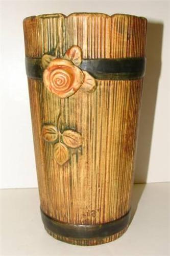 WELLER POTTERY WOODROSE VASE. Matte glaze. Relief decorated with flowers. Stamped on bottom “Weller”. 8.5” H