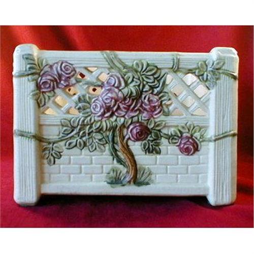 <p>This is a beautiful piece of Weller art pottery in the Roma Rose Arbor Reticulated pattern. It features a very pretty climbing rose bush and a reticulated top. It is made to look like a rose bush growing on a trellis wall.
