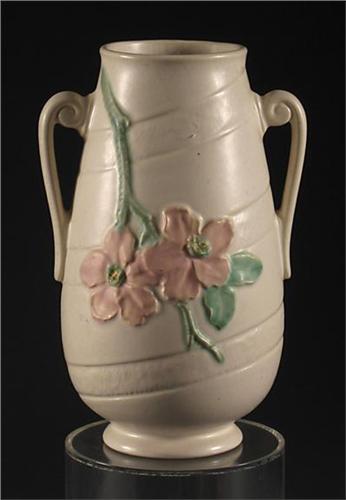 Weller matter white glaze handled vase with pink dogwood (?) relief decoration. Mid-20th c. 8.5'' H. Note crazing, tag residue, dark nicks.