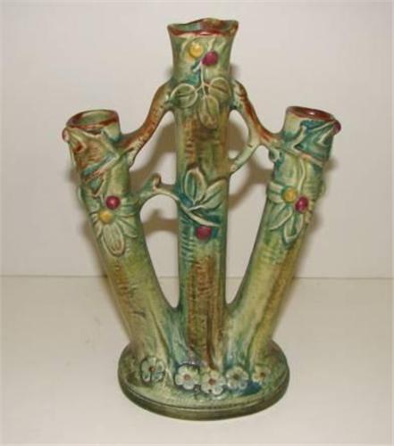 WELLER WOODCRAFT TRIPLE BUD VASE. Matte glaze. Relief decorated with branches, berries, & leaves. Unmarked. 7” H