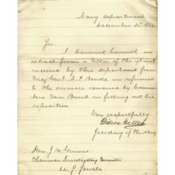 <b>633. GIDEON WELLES</b> (1802 - 1878) Lincoln's Secretary of the Navy who proposed the blockade of Southern ports and the construction of an ironclad fleet. War-date manuscript L.S. 1p. 4to., Navy Dept., Dec. 30, 1862, sending an extract of a letter from Major Gen. Nathaniel P. Banks concerning the services received by Comm. Van Brunt in fitting out his expedition. Near fine.<b>$75-100</b>