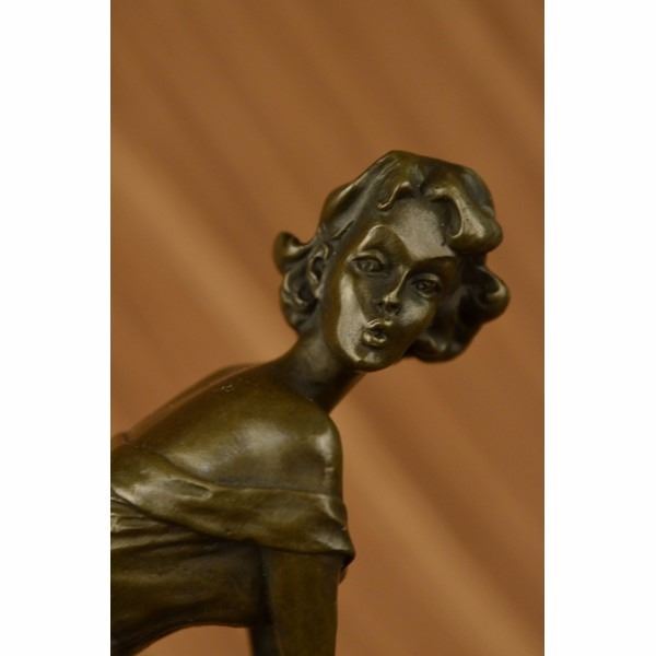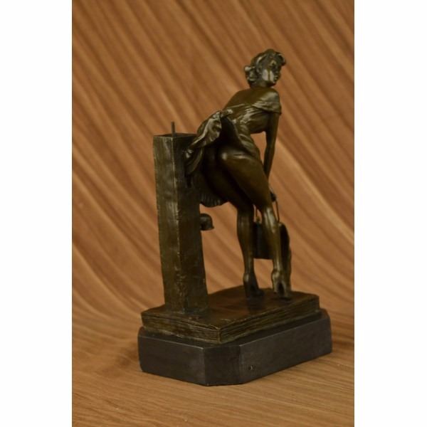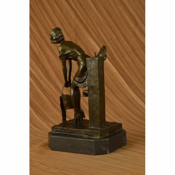 Uh oh! The well has got her skirt! This charming little sculpture by German artisan, Preiss depicts a woman who has just finished getting water from a water well pump. She has a bucketful of water and as she turned to walk away, her skirt got caught on the pump from the well, lifting it up and revealing her lack of undergarments. She turns her head in surprise and her reaction is captured marvelously here. The water has fallen out of the bucket and to make the situation even more entertaining, her bosom has also fallen out of her dress. The detail on this piece is exquisite, down to the details of the girl's heels and knee high stockings and to the fine texture of the wood grain on the well and the wooden planks she is standing on. Her face has been sculpted to bring out her true beauty and her hair is the perfect style to accentuate her slender face. Signed "Preiss" in the bronze. Condition: This sculpture is in perfect condition. Bronze Dimensions with Marble Base:Height 14" x Width 8" Marble Dimensions:8 1/2" X 7". Height without base: 13" Weight : 15 LBS Inventory:50Y5876305