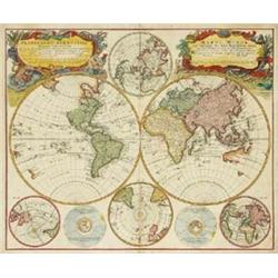 “Planiglobii Terrestris...”. Teilkolorierte Kupferstichkarte mit 2 ornamentalen Eckkartuschen mit Tierdarstellungen von G. M. Lowitz nach J. M. Hase bei Homann Erben, 1746. - Gr.-Fol. Zeigt in 2 Hemisphären die damals bekannte Welt, auf 4 kleineren Hemisphären die Welt mit dem Süd- bzw. Nordpol, mit der Stadt Nürnberg bzw. deren Antipode als Zentrum sowie auf 2 weiteren Hemisphären den Verlauf der Sonne. Mit hinterlegten Beschädigungen an der Bugfalte und an den Rändern, leicht angeschmutzt und gebräunt sowie stellenweise gering knitterfaltig.