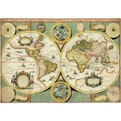 “Nova totius Terrarum Orbis geographica ac hydrographica Tabula”. Altkolorierte Kupferstichkarte mit Beschlagwerkkartuschen von Hondius bei N. Berey, Paris, 1640. - Qu.-Gr.-Fol. Zeigt in 2 Hemisphären die gesamte damals bekannte Welt mit reicher figürlicher und Schiffsstaffage, in den Zwickeln auf zwei kleineren Polhemispähren die Tierkreiszeichen, umgeben u.a. von Darstellungen eines immerwährenden Kalenders, der Planetenlaufbahnen und der verschiedenen Winde. Mit geglätteten Bug- und mehreren Längsfalten. Gering gebräunt und vereinzelt stockfleckig. Seitenränder mit minimaler Ergänzung der Darstellung angerändert.