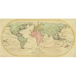 “Mappe-Monde ou Carte générale de l’Univers...”. Teilkolorierte Kupferstichkarte von M. A. Lotter, Augsburg, 1782. - Qu.-Gr.-Fol. Zeigt in einem Queroval die gesamte damals bekannte Welt, Teile Australiens und Neuseelands sowie die Route der Weltumsegelung von James Cook. Mit mehrfachen, geglätteten Längsfaltungen und leicht stockfleckig. Ränder mit Knickspuren.
