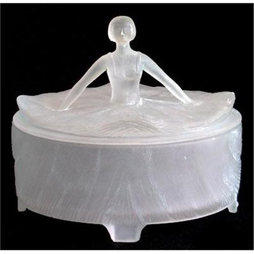 GUARENTEED ORIGINAL - This satin glass figural powder jar known as WENDY is shown and described on pages 34-35 in Whitmyer: Bedroom & Bathroom Glassware of the Depression Years. With a striking Art Deco design featuring a flapper girl with outstreched arms resting upon her skirt. She is wearing a low-cut gown with a double strand of beads around her neck. The base is four footed and she is beautifully executed with fine definition and attention to detail. The oval jar with lid measures about 4 1/2" tall x 5 1/2" x 4" and, with the exception of a small nick, just above the rim, on her dress, both are in excellent condition