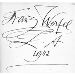 <b>1222. FRANZ WERFEL</b> (1890 - 1945) Czech-born Jewish poet, playwright and novelist, best remembered for his work <i>The Song of Bernadette</i> (1941). A fine Werfel item, his volume <i>The Song of Bernadette</i>, First American Edition, New York: The Viking Press, 1942, very boldly signed on the first free endpaper: "<i>Franz Werfel L.A. 1942</i>". Lacking dustjacket, else very good condition.<b>$150-250</b>