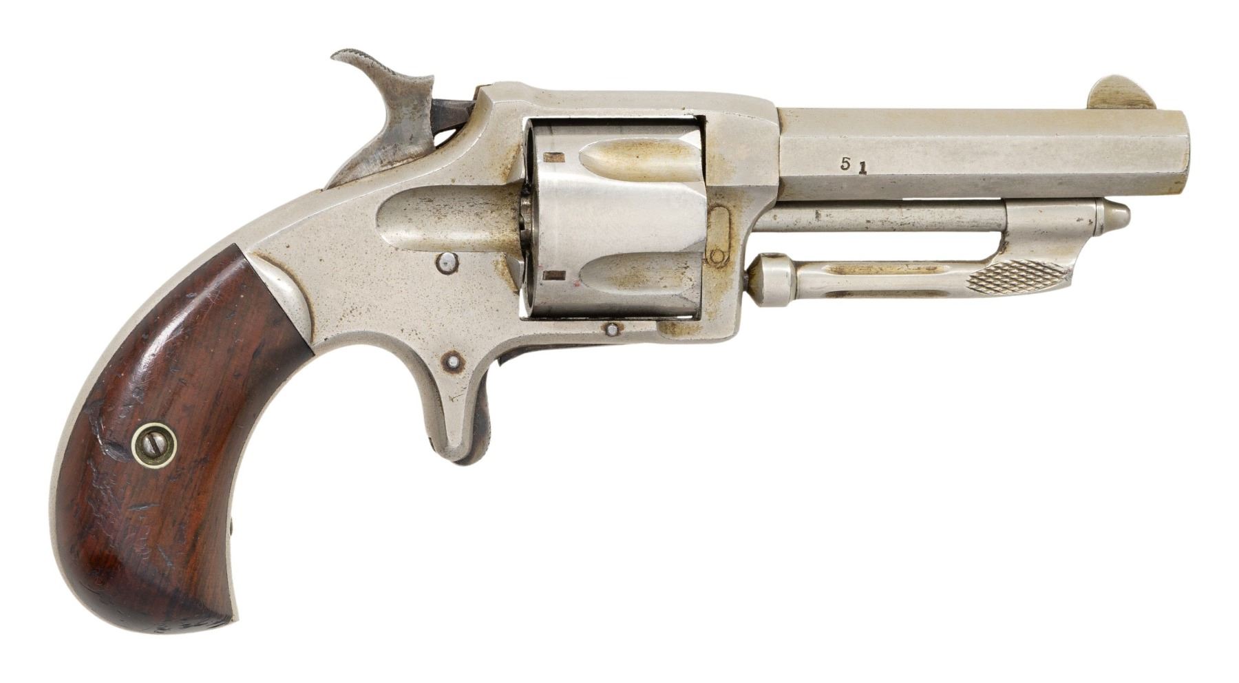 REVOLVER. Cal. 32 RF. S# 14663 (under grips). Matching numbers on 2 1/2" bbl., 5 shot cyl. & rosewood grips. Additional "51" stamped on right side of barrel. CONDITION: good silver finish with patina & light fading of finish. Fair wood finish with deep marks. Gunsmith attention needed; hammer is stiff operating & has difficulty releasing from full cock. (01-27865/MD). ANTIQUE. $75-150.