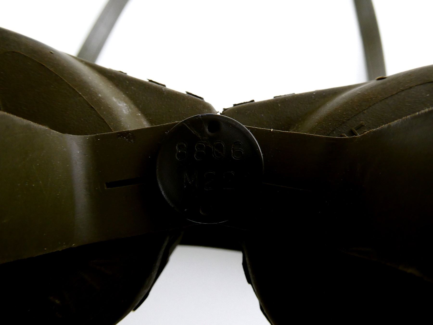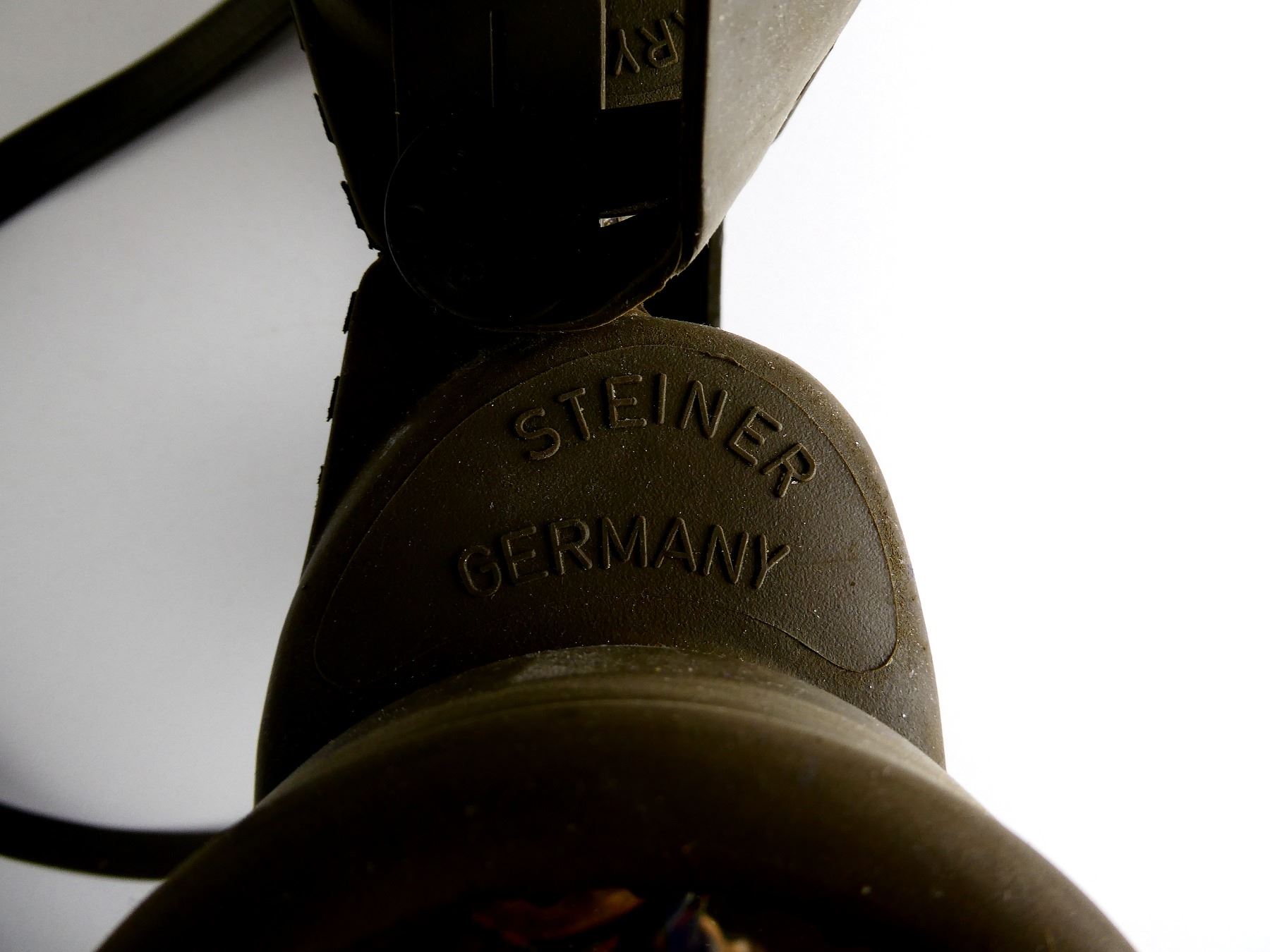 (1) GREEN RUBBER / PLASTIC CONSTRUCTED BINOCULARS, MARKED: "STEINER GERMANY", "MILITARY-MARINE, 7X50, MADE-IN-W.GERMANY", "8806, M22" & VARIOUS OTHER MARKINGS ON LID OF EYE PIECE COVER, WITH GREEN RUBBER / PLASTIC NECK STRAP, CLEAR OPTICS, LENSES INTACT, MAGNIFICATION RINGS WORK, MISSING RUBBER AROUND ONE OF THE EYE PIECES, SHOWS WEAR. SEE PHOTOS.