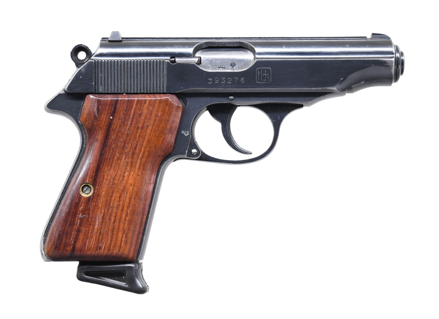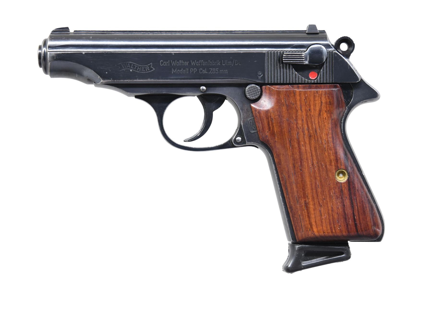 SEMI-AUTOMATIC PISTOL. Cal. 7.65mm. S# 393276. Bbl. 3 7/8". Model PP semi-automatic pistol mfg. by Walther for the West German police in 1969. The left side of the slide is marked with the Walther banner logo, followed by markings stipulating Walther's mfg. information, as well as the model and cal. designations. Left side of the frame and right side of the slide exhibit a boxed "Nds" proof, indicating issue to the German Niedersachsen Police. Right side of the frame is marked "69", followed by an Ulm Proof House antler, as well as with an Eagle/N commercial nitro proof. Metal components exhibit a lustrous high polish blue finish overall, save for on the chamber, which is polished in-the-white. Frame is mounted with 2-piece aftermarket plain wood grips. Slide features a matte rib, with a fixed blade front sight, and dovetailed square notch rear sight. MAGS: 1 aftermarket 8-rd., with black synthetic grip extension. UNATTACHED ACCESSORIES: generic black soft case. CONDITION: metal components retain the majority of their original factory blue finish, exhibiting some areas of light to mild wear and thinning, as well as some small scattered splotches of losses to the finish. Mirror bore, retaining well defined rifling throughout. Grips are very good overall. (25-1013/MLW). CURIO. $300-500.