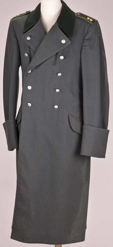 West German police overcoat, issued to a sergeant first class, heavy green wool with dark green collar, epaulettes each with two pips, lining fine. Overall excellent condition and an attention-getter on the ski slopes!