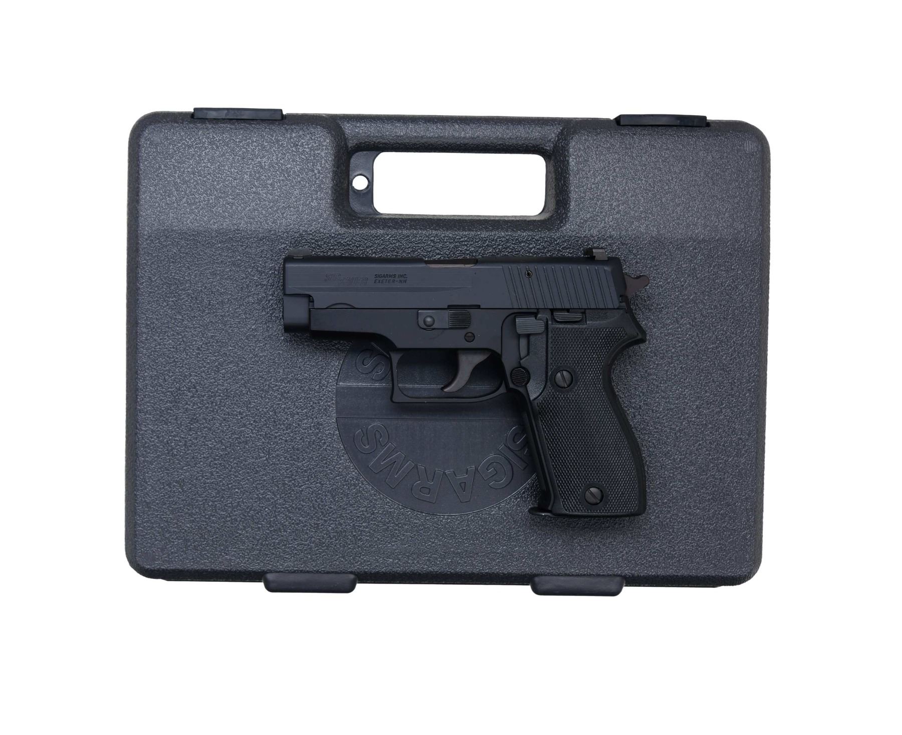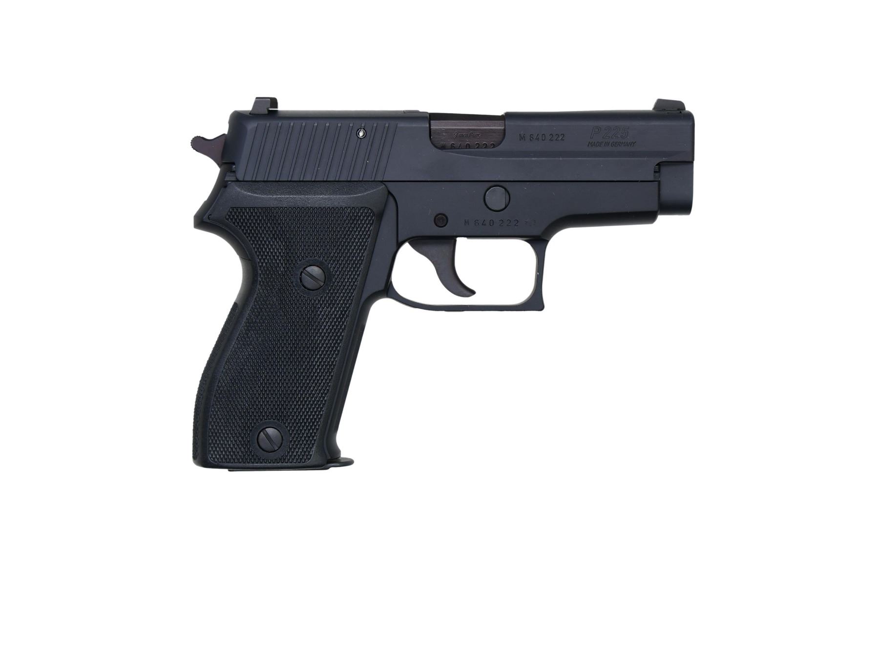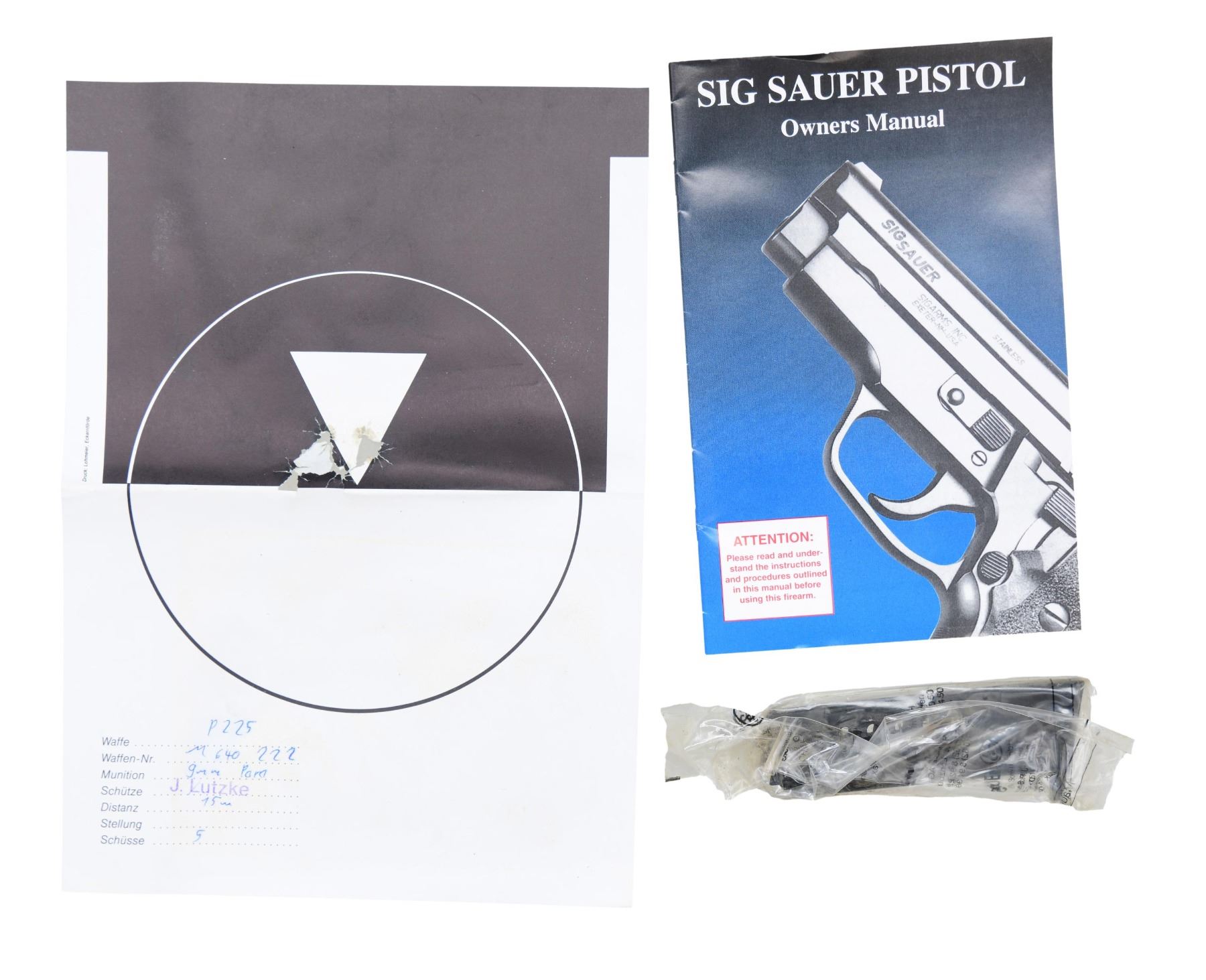 Cal. 9x19 S# M640222 (1997). Bbl. 3.9", with fixed front and rear sights. This Sig Sauer P225 features a matte black finish. The frame has a left-side decocker and a left-side magazine release. The grips are checkered black plastic. MAGS: two 8-rd. UNATTACHED ACCESSORIES: factory box, manual, and test target. CONDITION: overall near excellent condition. Slide retains approximately 95% of its original finish. Frame shows about 95% of its original finish. Bore is bright with strong rifling. PROVENANCE: the lifelong collection of Terrence McCarty. (24-414/MD). MODERN. $400-$600.