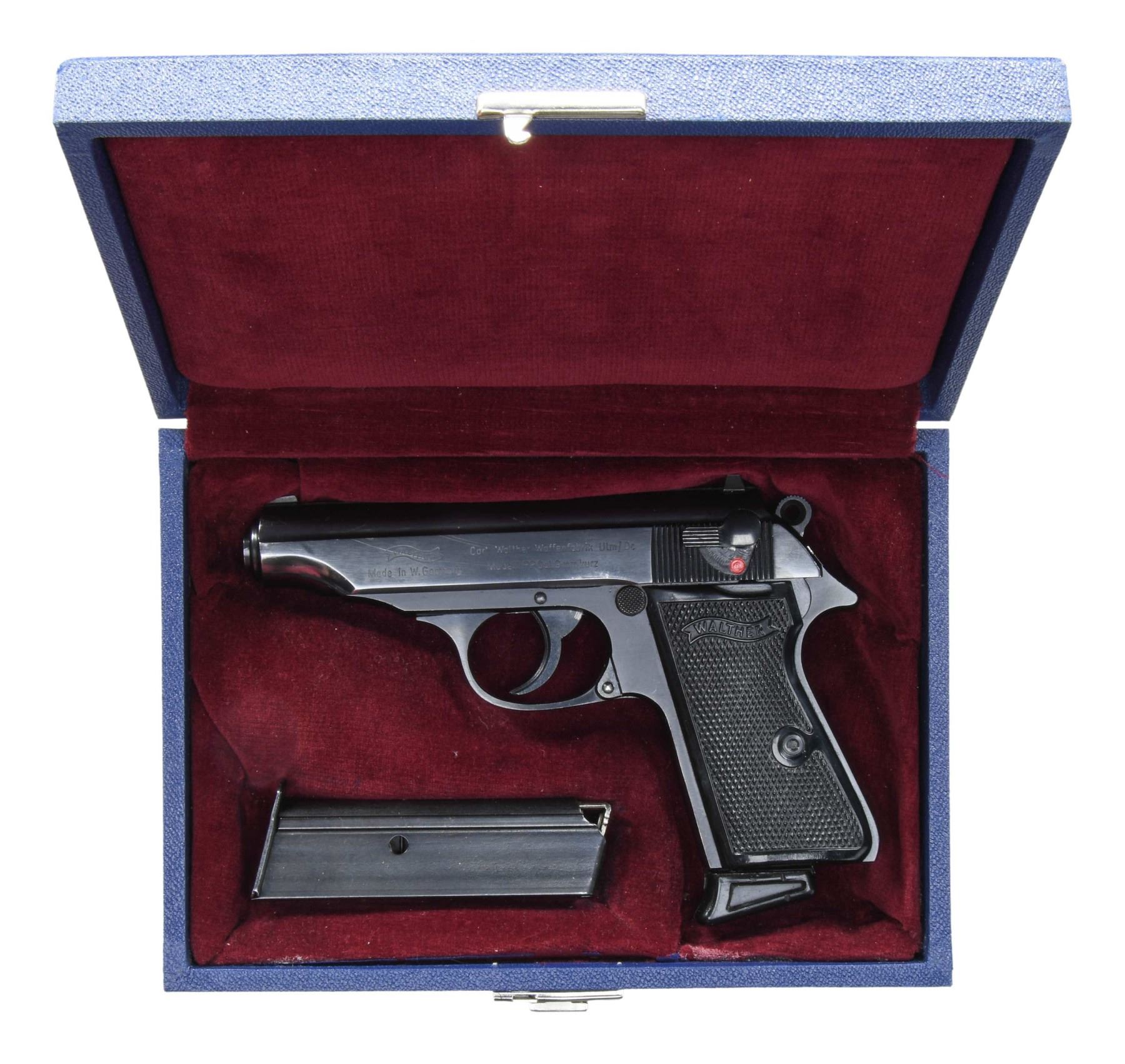 WITH FACTORY CASE. Cal. 9mm Kurz. S# 53137A. Bbl. 3 7/8". Model PP semi-automatic pistol mfg. in West Germany by Walther in 1973. Left side of the slide is marked with the Walther banner logo above "Made in W. Germany", followed by markings denoting Walther's mfg. information, as well as the model and cal. designations. Right side of the frame (on chamber) is marked with the 2-digit year of mfg. "73", followed by an Ulm Proof House antler and a stamped Eagle/N commercial nitro proof (Eagle/N repeated on left side of slide). Right side of the bbl. is electro-penciled with an Eagle/N. Metal components exhibit a blue finish overall, with the chamber area of the frame being polished in-the-white. Frame is mounted with 2-piece checkered black synthetic Walther banner grips. Slide features a raised grooved matte rib, with an integral blade front sight and dovetailed square notch rear sight. Slide matches the frame via "53137". MAGS: 2 7-rd. mags., 1 with black synthetic grip extension. UNATTACHED ACCESSORIES: blue leatherette factory case with red velour interior. Case contains spare mag. and factory manual. CONDITION: metal components retain the majority of their original factory blue finish, showing some light edge wear, a patch of finish loss on the right forward edge of the slide, as well as some light superficial handling marks overall. Brilliant mirror bore, retaining well defined rifling throughout. Proper manual mechanics, to include the safety / decocking lever. Grips show some scattered handling marks and nicks to the diamonds. Case is very good, with light exterior wear. (25-5130/MLW). CURIO. $1,200-1,800.