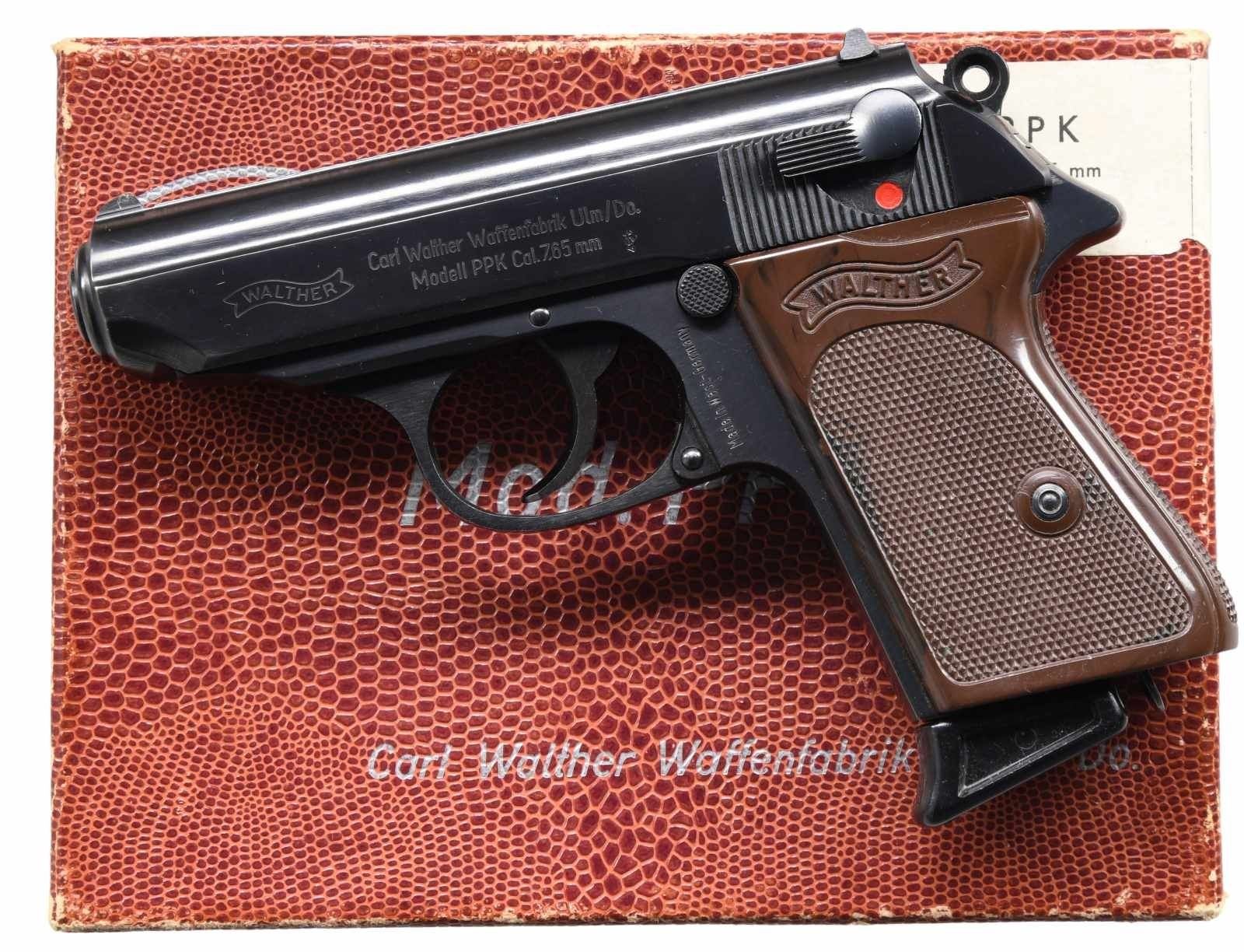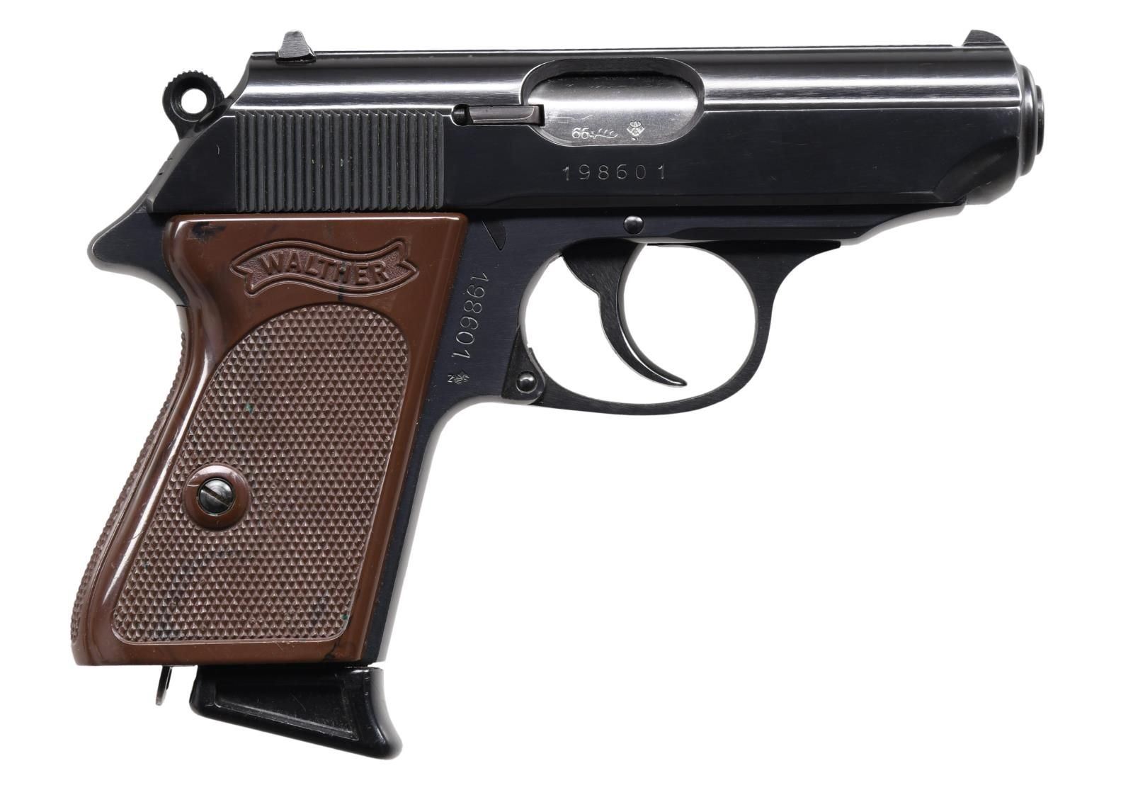 WITH MATCHING FACTORY BOX. Cal. 32 ACP. S# 198601. Bbl. 3 1/4". Model PPK semi-automatic pistol mfg. in West Germany by Walther in 1966. Left side of the slide is marked with the Walther banner logo, followed by markings stipulating Walther's mfg. information as well as the model and cal. designations. Left side of the frame is marked "Made in West-Germany". Chamber is marked with the 2-digit year of mfg. "66", followed by an Ulm Proof House antler and an Eagle/N commercial nitro proof that is also present on the left side of the slide and on the right side of the frame. Metal components exhibit a blue finish overall. Frame is mounted with 2-piece Walther banner checkered mottled brown plastic grips. Mag. features a black plastic extension. MAGS: 2 7-rd. UNATTACHED ACCESSORIES: matching factory cardboard box containing its original manual, 1 spare mag., as well as a cleaning rod. CONDITION: excellent, with metal components retaining bountiful amounts of their original factory finish, exhibiting a few light superficial handling marks overall. Mirror bore, exhibiting grease and well-defined rifling throughout. Grips exhibit some scattered nicks to the diamonds, but otherwise are good overall. Box shows light to mild exterior wear but otherwise remains sturdy and serviceable overall. (24-999/MLW). CURIO. $800-1,200.