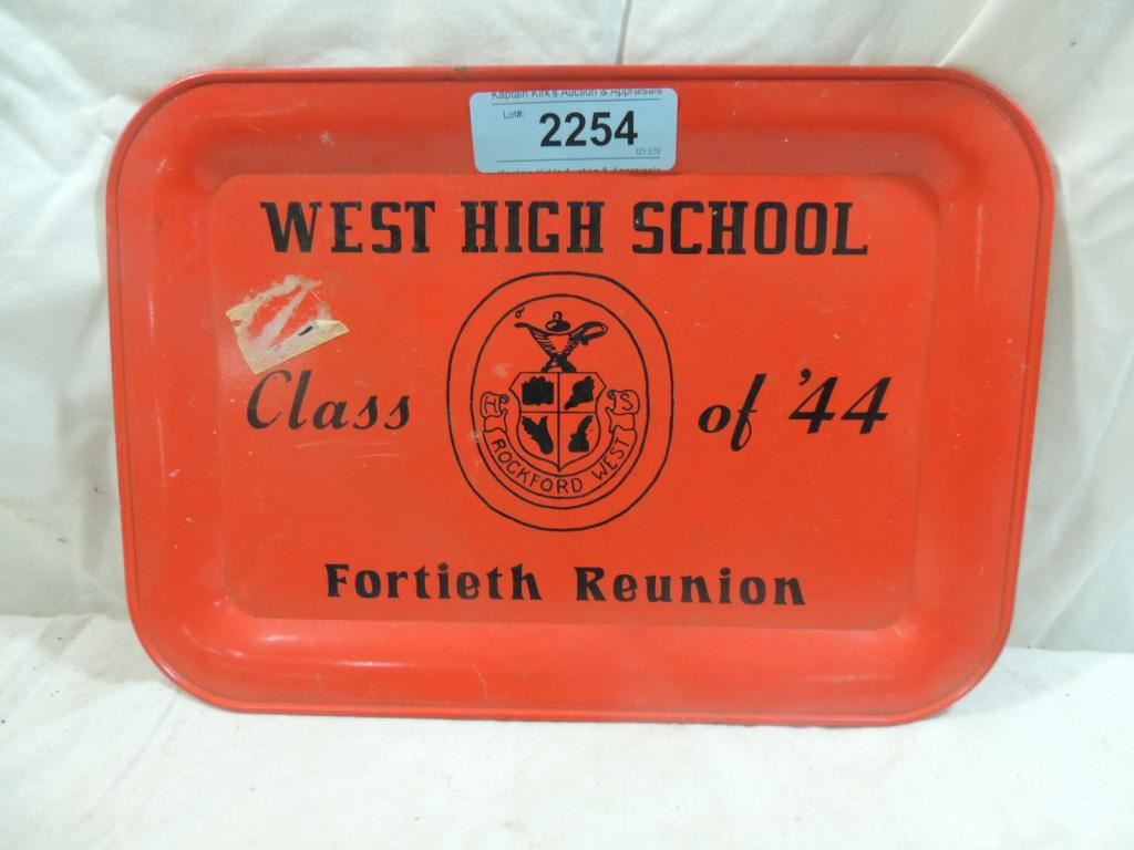 WEST HIGH SCHOOL CLASS OF 1944 14TH REUNION TRAY, DECORATIVE TRAY, ROCKFORD SCHOOL, RED TRAY, COLLECTORS TRAY AS SHOWN SEE PHOTO FOR MORE DETAILS.