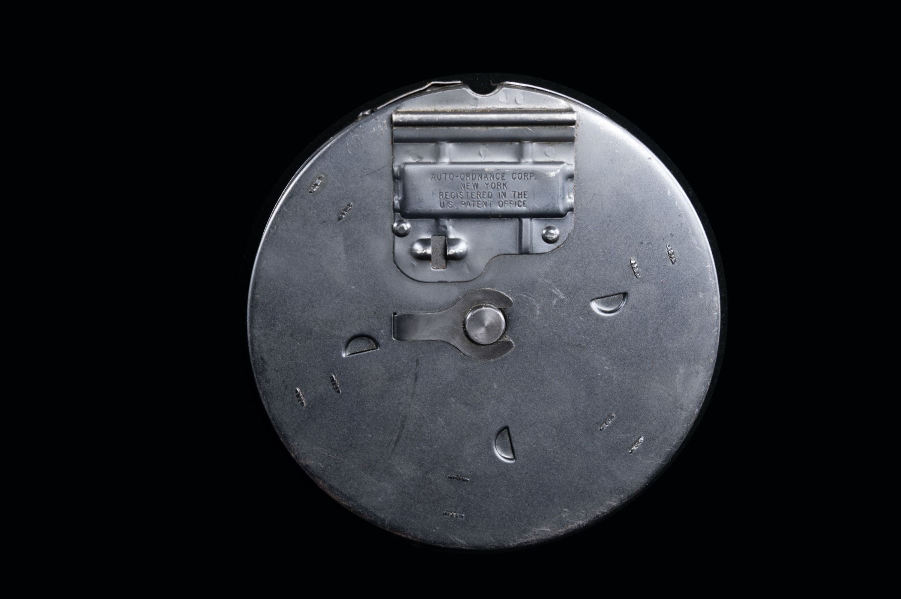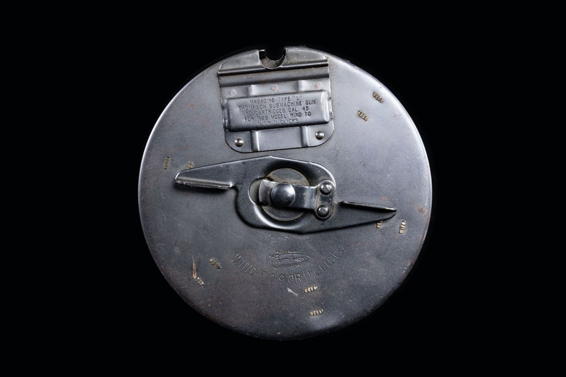 "L" DRUM MAGAZINE. 50-rd. drum mag. for the Thompson submachine gun mfg. in West Hurley by Auto Ordnance. Front plate is stamped "MAGAZINE TYPE "L"/ THOMPSON SUBMACHINE GUN/ 50 CARTRIDGES CAL. 45/ FOR 1928 MODEL WING TO/ 9 OR 11 CLICKS", with "AUTO-ORDNANCE CORP./ NEW YORK/ REGISTERED IN THE/ U.S. PATENT OFFICE" on the rear plate. Blue finish. CONDITION: metal components retain the majority of their original factory blue finish, showing scattered superficial handling marks and spots of light to mild surface oxidation. Bottom edge of drum cover exhibits an impression. (02-25518/MLW). NON-GUN. $200-300.
