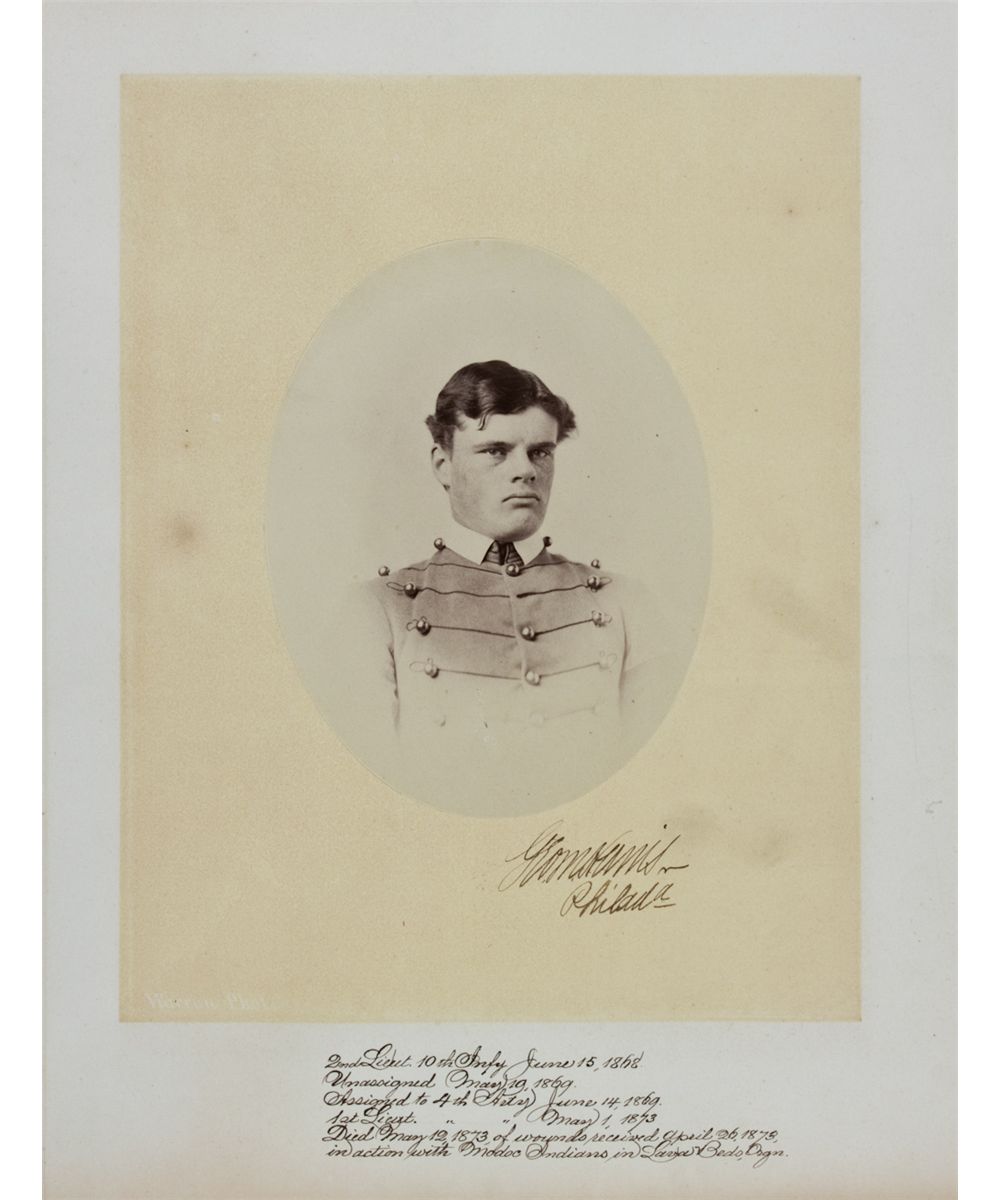 A scarce S.P., an oval mounted albumen 4 1/2" x 6" sepia of a West Point officer, United States Army Officer. An 1868 graduate of the United States Military Academy at West Point, New York, he was commissioned as a 2nd Lieutenant in the 10th United States Infantry on June 15, 1868. A little over a year later (July 14, 1869) he was transferred to the 4th United States Artillery's Battery K. He participated in the 1872-1873 Modoc War, and was mortally wounded on April 26, 1873 in what was called the Battle of Sand Butte (which in fact was little more then an ambush by a band of Modoc Indians who attacked a reconnaissance force Lieutenant Harris was part of). First thought killed, he lingered until May 12, 1873, just 24 hours after his mother, who traveled from Philadelphia to California upon receiving word her son was wounded, arrived at his death bed. After his death she brought his body home to Philadelphia. "Philada", mounted to a larger 10" x 13" sheet. Period note at bottom of sheet reads: "2nd Liet. 10th Infy, June 15, 1868. Unassigned May 19, 1869. Assigned to 4th Arty June 14, 1869. 1st Lieut..., May 1, 1873. Died May 12, 1873, of wounds received April 26, 1873 in action with Modoc Indians in Lava Beds, Orgn". Very good condition, certainly worthy of further research.