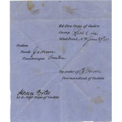 <b>1055. WEST POINT PASS </b> A rare partly-printed D. S. "<i>Horace Porter</i>" 1p. 5 1/2" x 6 1/2", an official West Point pass "<i>Camp Rob't E. Lee, June 29, 1859</i>" authorizing that "<i>Trenton</i>" would be the official countersign used by Cadet Jackson when challenged by the camp guard upon his return to camp from leave on the above-mentioned date. Authorized by future Confederate general William Hardee while commandant of cadets and endorsed, on the verso, by <b>RICHARD DELAFIELD</b> (1798-1873) with rank as superintendent of the Military Academy. A truly unique West Point document that has numerous Civil War connections, and the first we have encountered. Typical triangular folds for these types of documents, otherwise very good.<b> $150-200</b>