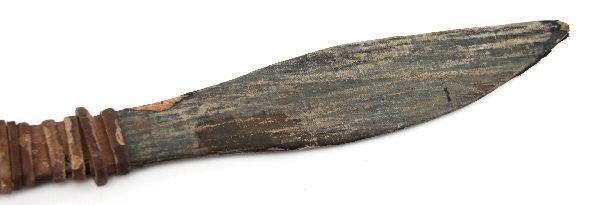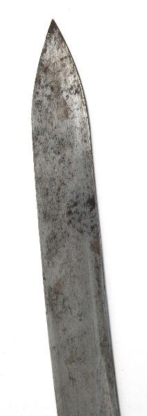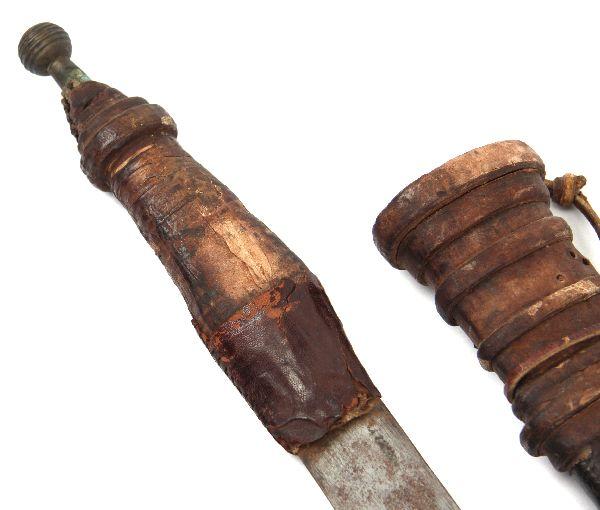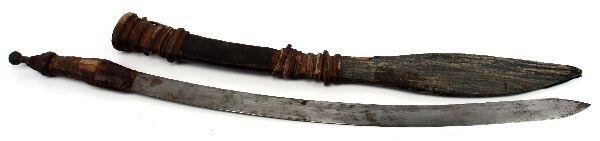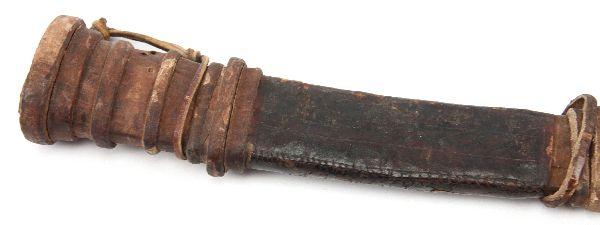 West Saharan Manding (Mandingo) saber. 26 inch curved saber like blade, with shallow fuller, and canvas and leather wrapped grip. Leather over canvas, over wood scabbard. Some rust to blade. Leather on scabbard is mostly missing, with remainder brittle from age. Appears late 19th to early 20th Century. Exact age unknown. Good to very good example.