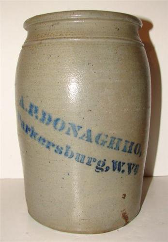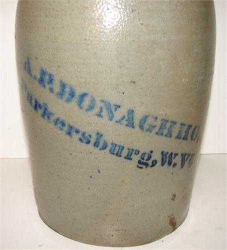 WEST VIRGINIA STONEWARE CROCK. Cobalt blue text on body reads “A.P. Donaghho/Parkersburg, W.Va.” Shows one small vertical tight hairline crack at bottom. 9.75” H