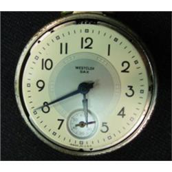 Westclox day pocket watch has numbers 1563431, 1709146 and 1848520. Very worn case, size #14, yellow crystal, working condition unknown. Ca 1930's.