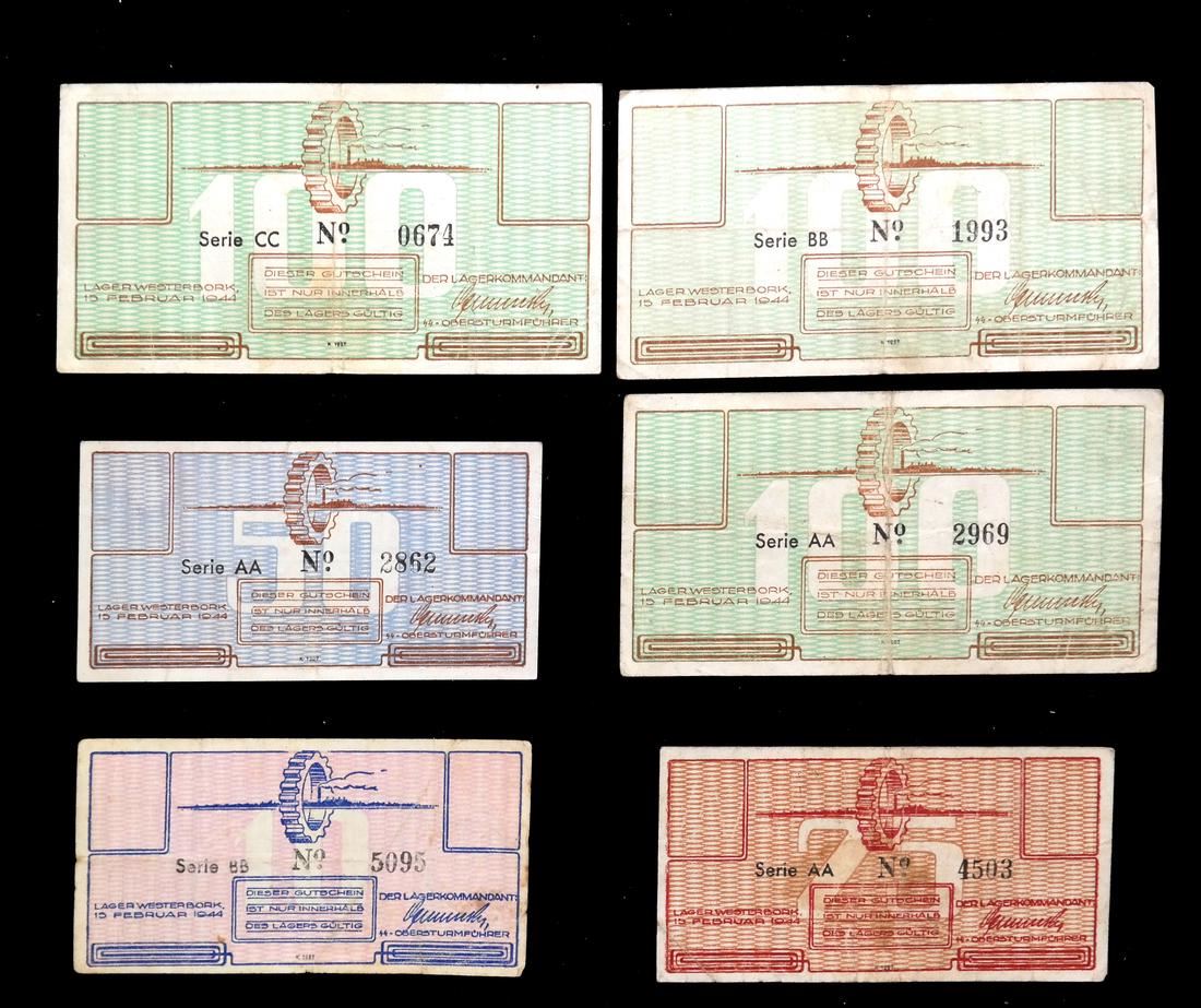 Selection of watermarked issues including 10c series BB Very Fine, 25c series AA Very Fine, 50c series AA About Uncirculated, 100c series AA Fine+, 100c series BB Fine+, and 100c series CC Very Fine.