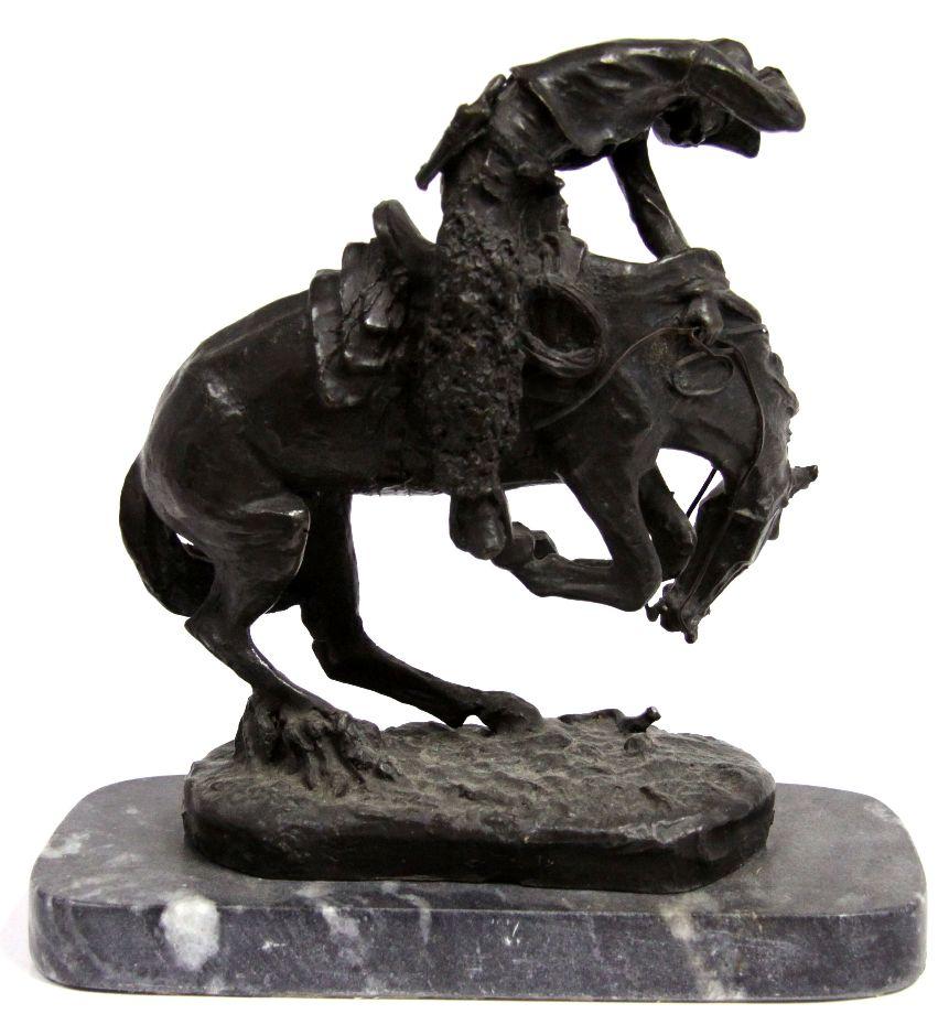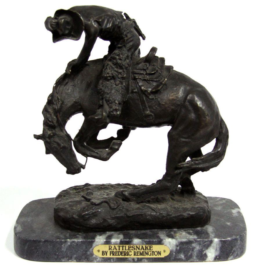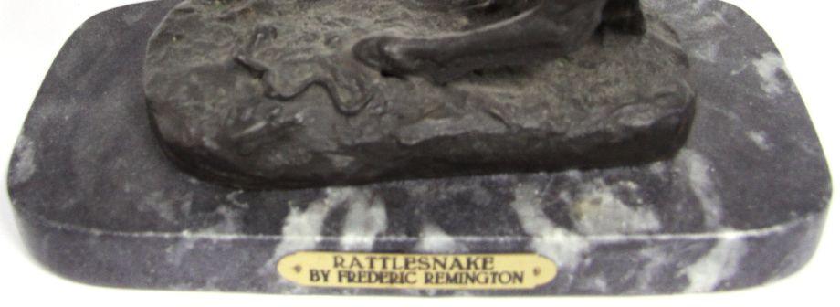 A Remington 12 inch better quality and detail Rattlesnake bronze Statue, atop marble plinthe with brass plaque.