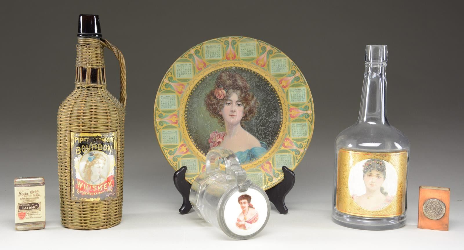MORE. This lot includes 1 clear 10 1/2" bottle, likely for whiskey, with a label under glass depicting the bust of a woman. / 1 Amber whiskey bottle covered in wicker with a label under glass that reads "PIPER COMPANY BOURBON WHISKEY SYRACUSE N.Y." with a central oval of a woman. / 1 Clear glass beer mug with a pewter top & porcelain lid depicting an attractive woman. / 1 Tin advertising calendar 9 1/2" plate for the year 1910 with a central figure of an attractive woman. The reverse reads "COMPLIMENTS OF THE SEASON WM. GADSBY & SONS COMPLETE HOUSE FURNISHERS PORTLAND, OREGON". / 1 Match safe depicting an attractive woman on one side with advertising on the other that reads "COMPLIMENTS OF SELIG BROS & CO SAN FRANCISCO'S LEADING WHOLESALE TAILORS SATISFACTION GUARANTEED 8 AND 10 BATTERY ST. ALWAYS UP TO DATE". / 1 Match safe in copper with a silver coin on the front that reads "DEUTSCHES REICH 1904 ZWEI MARK" with a central crowned German eagle. CONDITION: all items show light wear. The plate has craquelure on the center portrait. PROVENANCE: From the Lifelong Collection of Glen E. Mattox. (02-18774/BF). $300-500.