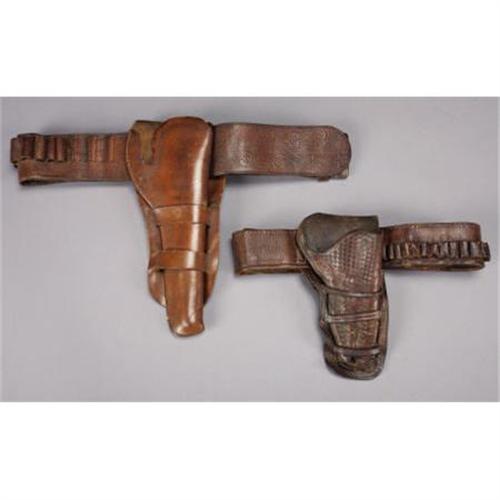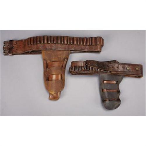 <B>FRONTIER GUN LEATHER</B></I> - <BR> a) WESTERN BELT AND HOLSTER RIG; Holster is a triple loop basket stamp design in the classic Meanea style. The belt is 2¼ wide with .38 loops; both are well worn; the belt has been shortened and the billet has been moved. <BR> b) COWBOYS GUN RIG WITH MARKED BELT; “Denver Manufacturing Company (1881-1893) maker marked belt is roll embossed with double buckles; It is a 3” wide belt with long .45 cal loops; The holster is a catalogue double loop for a long barrel double actions; both have good color and the belt has 4 missing loops.<BR><BR><b>Shipping:</b> Miscellaneous Collectibles, Larg (<a target="_blank" href="http://www.heritageauctions.com/common/shipping.php">view shipping information</a>)