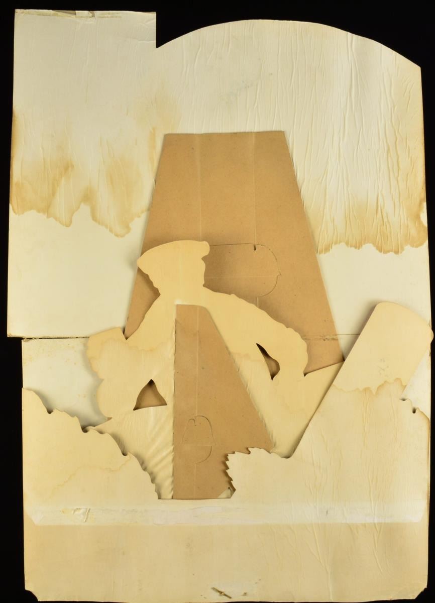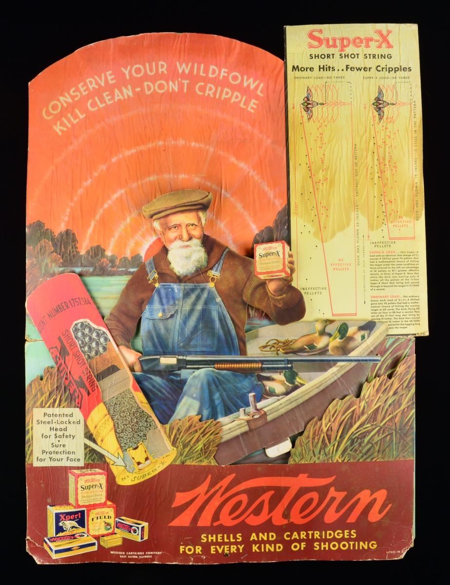 ADVERTISING LITHO. 38" x 29", back section depicts sunrise over a duck marsh w/ label "CONSERVE YOUR WATERFOWL / KILL CLEAN - DON'T CRIPPLE" along side diagrams illustrating the Super X short shot string w/ the slogan "More Dunks, Fewer Cripples". Overlay cutout depicts an old man in a duck boat w/ a Winchester Model 12 solid rib pump shotgun across his lap holding a box of Western Super-X shotgun shells. 28" Wide x 21", front piece displays a cutaway Super-X shot shell over a variety of Western cartridge boxes w/ the slogan "WESTERN / SHELLS AND CARTRIDGES / FOR EVERY KIND OF SHOOTING". Side bar proclaims the shells & have "Patented Steel-Locked Head for Safety, Sure Protection for Your Face". Bottom of display marked "WESTERN CARTRIDGE COMPANY / EAST ALTON, ILLINOIS". CONDITION: back panel has foldout stand attached edges at center seam showing some light tearing. Duck boat cutout has fold out stand attached. Front panel has sm. tears at bottom corners & is missing fold out stand. All 3 pieces show some wrinkling & discoloration from water damage. Colors are generally bright showing minimal light. (02-13985/DS). $1,500-2,500.