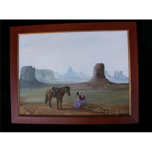 This is a wonderful, mesmerizing oil of a Navajo (Dineh) woman at rest with her horse and companion. The two are wonderfully captured embraced by the surrounding beauty of her people's native land. The very famous monolith structures in Monument Valley, AZ. are awesome. The history of this historical territory is rich in tradition and the Navajo people and still home to appx 200 tribal Navajos who still roam the Mittens. <p>Little is known of the artist, Carolyn Greer, Realism and strong emotion theme. Depicts Navajo woman and her horse in soft hues of gray, blues, violets and warm earth-tones embraced in the beauty of her homeland. Circa: 1980's. Professionally framed. Fine Condition<p>Measurement: 21-1/2" X 27-1/2" Professionally framed.