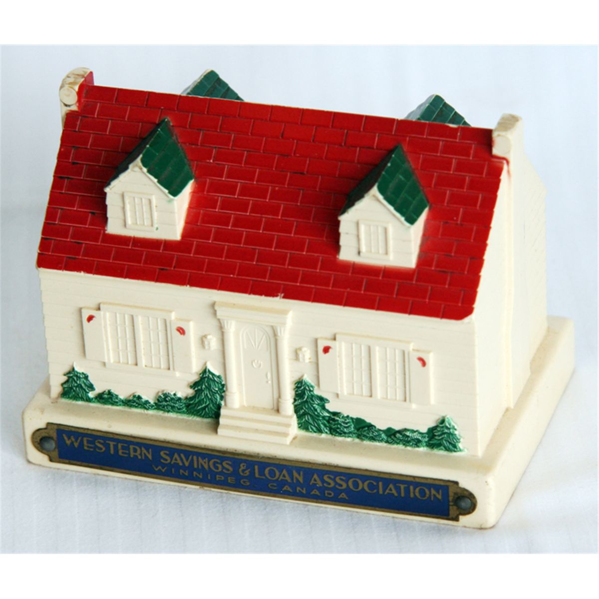 WESTERN SAVINGS & LOAN ASSOCIATION, WINNIPEG, CANADA. A tan and red plastic bank in the shape of a house. Coin and banknote slots on bottom. No key present. 6cm x7cm x 10cm. Maker-Chicago Thrift-Etching Corp., Chicago, Ill. Pat. 1458146. EF.