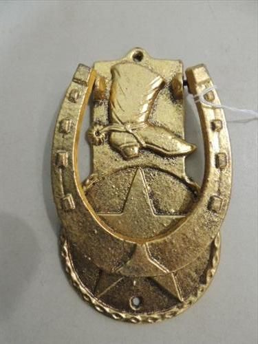 WESTERN STYLE DIE CAST IRON HORSESHOE DOOR KNOCKER. GOLD TONE. AS SHOWN. VIEW PICTURE FOR DETAIL.