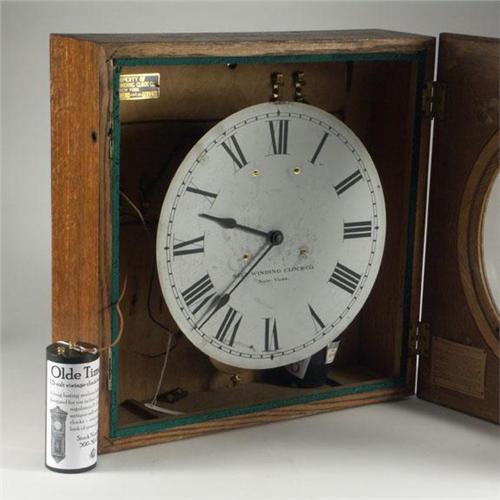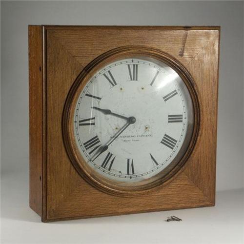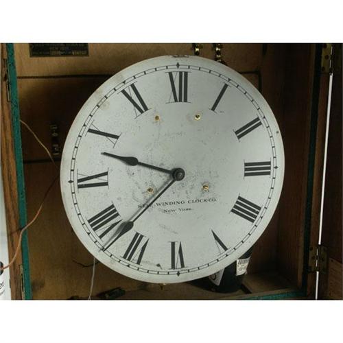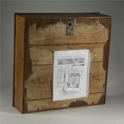CLOCK: A Western Union oak self winding clock, original dial, hands, New York, mainspring and pendulum with electric motor that winds the mainspring by one revolution per hour, 21'' square x 6.50'' deep. The clock has a second motor whose original function was to receive a signal from the Naval Observatory one time a day to insure the clock maintain accurate time (service no longer available). Included with the clock are details as to the working, repair, and maintenance of this historical clock, circa 1900 -1930, untested. Note: the thin wood back cover is missing for the most part.