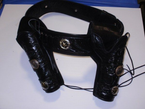 MEXICAN MADE BLACK LEATHER GUN BELT W/DOUBLE HOLSTERS W/BADGE STAR ADORNMENTS
