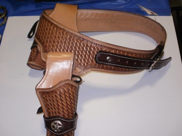 2 TONE GUN BELT W/DOUBLE HOLSTERS W/BASKET WEAVE DESIGN
