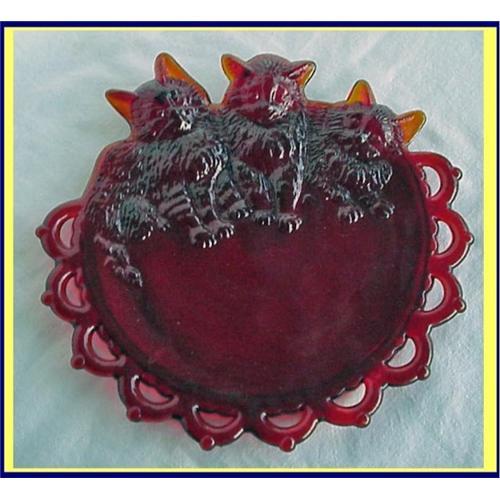 Red pressed glass card tray with 3 cats made by the Westmoreland Glass Company, Grapeville PA (1889 - 1984). <P><P>