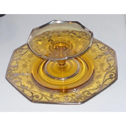 DURING THE DEPRESSION, WESTMORELAND EMBELLISHED GLASS WITH MULTIPLE PROCESSES TO KEEP HELP THE ARTISTS. THIS GRAND CHEESE & CRACKER SET IS A RESULT.</em></td>