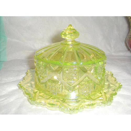 FOR SALE IS A BEAUTIFUL VASELINE DOMED BUTTERDISH BY WESTMORELAND IN THE OLD QUILT PATTERN. THIS BUTTERDISH MEASURES 5 1/2 IN. TALL AND 7 1/4 IN. IN DIAMETER AND IS IN VERY GOOD CONDITION WITH NO CHIPS, CRACKS OR REPAIRS.