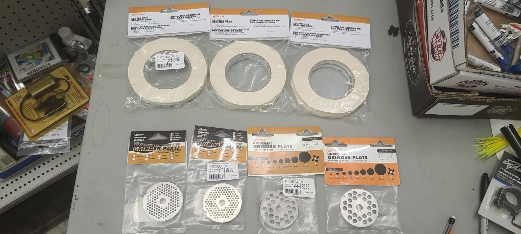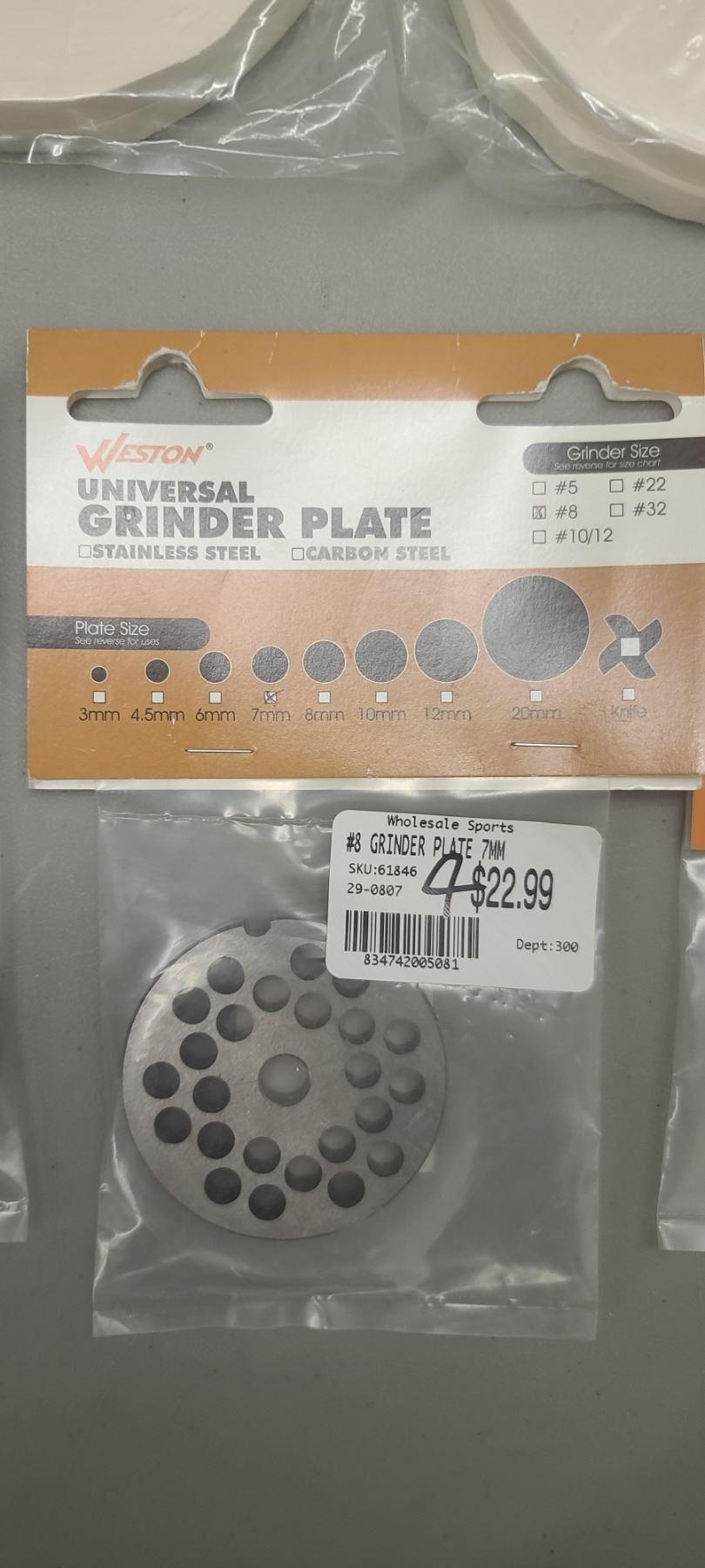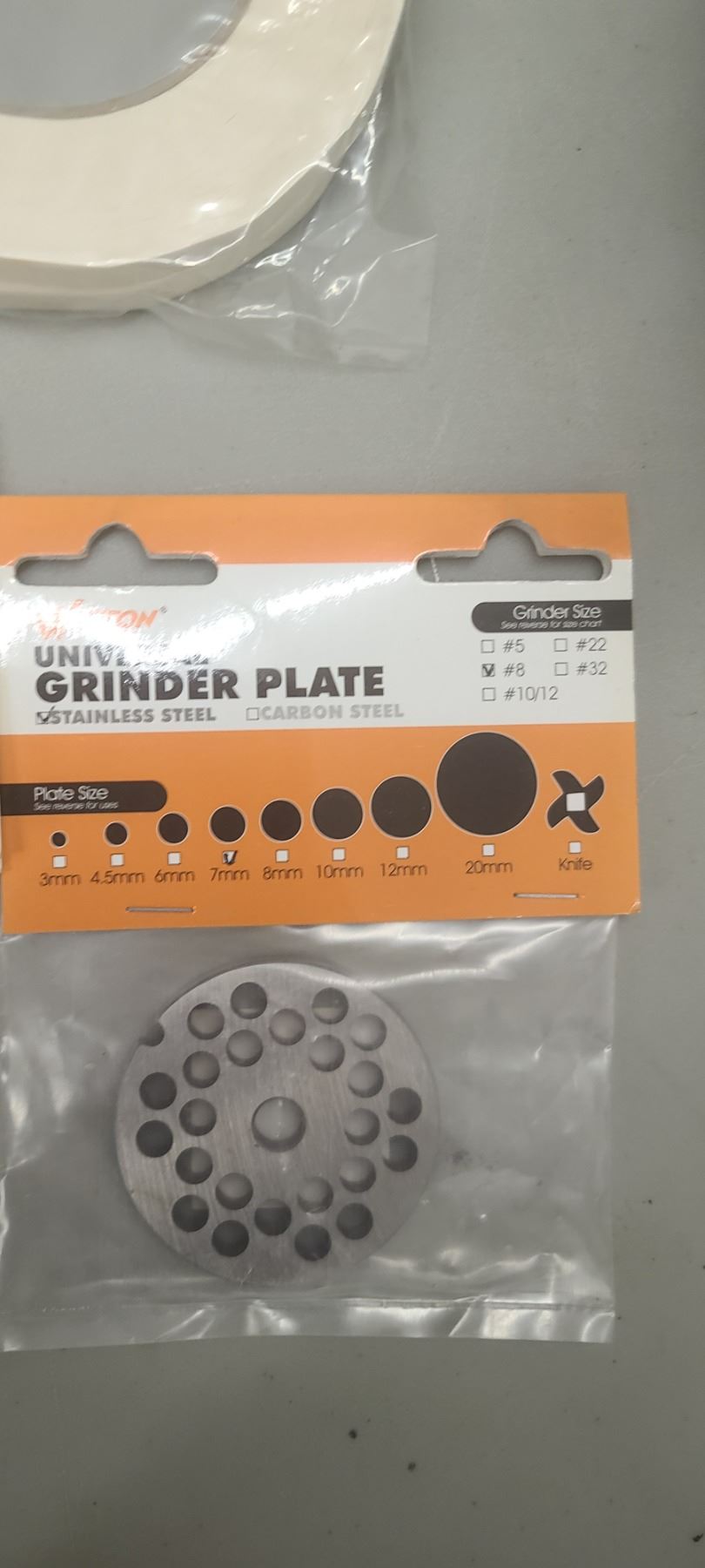 WESTON GRINDER PLATES: 3MM QTY X 2, 7MM QTY X 2 PLUS PVC BAG NECK SEALING TAPE. RETAIL VALUE $146