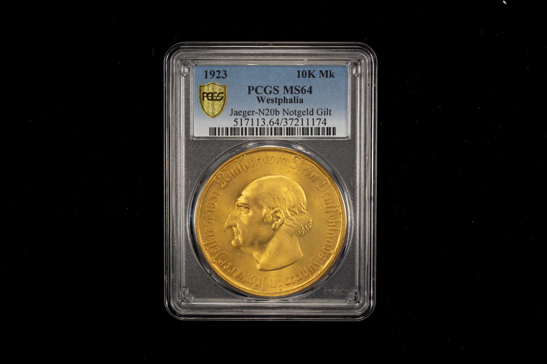WESTPHALIA: 10,000 mark, 1923, J-N20b, gilt notgeld, the Saxon Steed from the Province of Westphalia // Heinrich Friedrich Karl vom und zum Stein portrait, PCGS graded MS64.